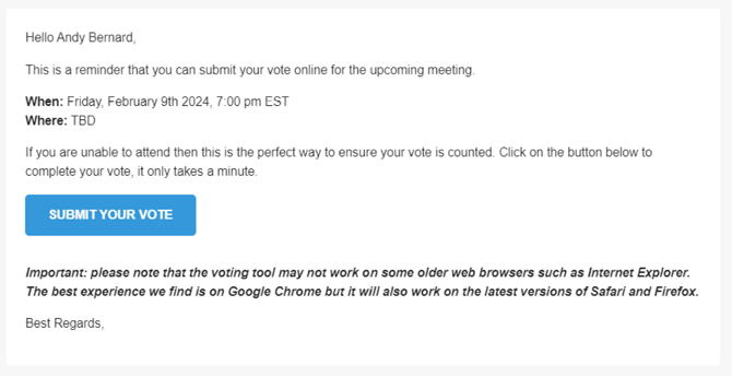 Members will receive an email invitation containing meeting details and a direct link to cast their vote.