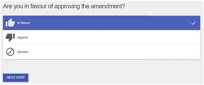 For agenda items requiring approval — such as by-laws, resolutions, or amendments — members will see a specific question (e.g., "Are you in favour of approving the amendment?").